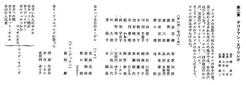 | 2 | 「チロリアン・スプリング」 | 「ヨハン大公のヨ−デル」 「ヨハン大公のヨ−デル」ケ−フェルベルグに登って」 「すいれんポルカ」 *「カッコ-時計」 「フディツゲラ−」 「ルツュルンからヴュギスまで」 「夕べの鐘」 「クラリネット・ポルカ」 「山の人気者」 |