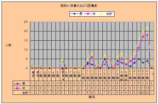 | 40秋 | 24 | 福井圭子・鈴木麗子・岩間文子・林協子・町田和子・山下和子・大庫幸子・新(板)倉まり子・佐藤玲子・野沢春美・種本ミチ子・三谷麻利子・児玉玲子・佐藤由利子・飯田安美・平地築美・鯨井早智子・堀智恵子 | 18 | 吉川年行・前新和則・西山博通・東六彦 | 4 | 22 |